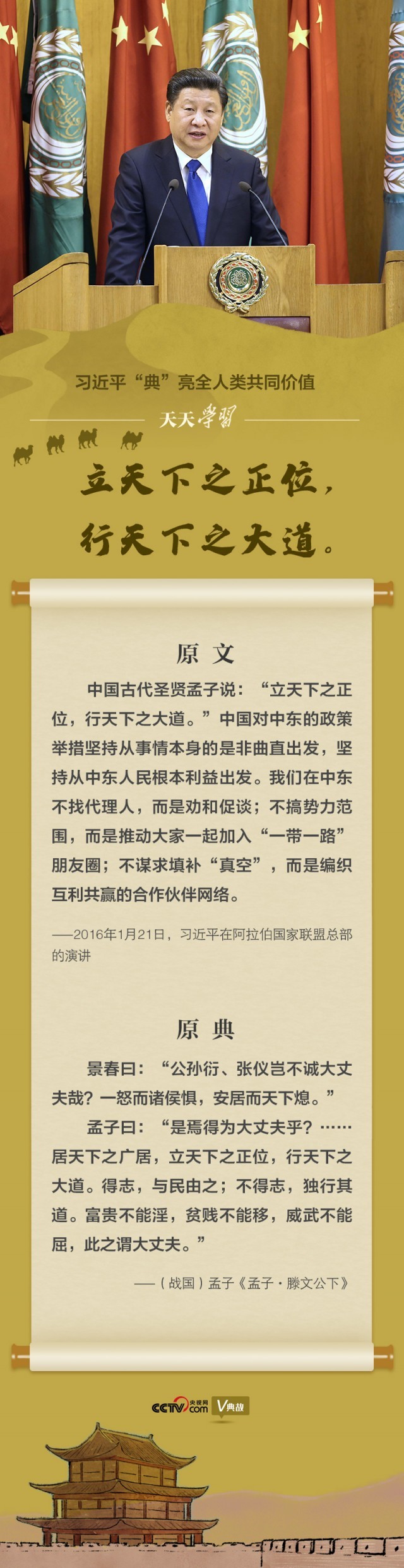2016年,在开罗阿拉伯国家联盟总部发表的演讲中,习近平主席阐释了中国的中东外交政策。他借用最能代表中华文化基本精神的“大丈夫”思想,掷地有声地告诉世界,中国的中东外交,立正位、行大道,不找代理人,不搞势力范围,不谋求填补“真空”,坚定地做“中东和平的建设者、中东发展的推动者、中东工业化的助推者、中东稳定的支持者、中东民心交融的合作伙伴”,充分彰显了为世界谋大同、推动构建人类命运共同体的大国担当。