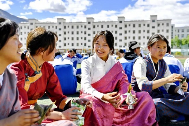 西藏山南市第二高级中学的学生品尝安徽省援藏干部和企业家代表赠送的粽子(2022年6月3日摄) 张汝锋摄/本刊