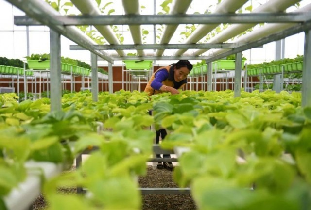 西藏阿里地区噶尔县生态农业产业园工作人员在打理管道式水培种植的蔬菜(2017年9月1日摄) 晋美多吉摄/本刊
