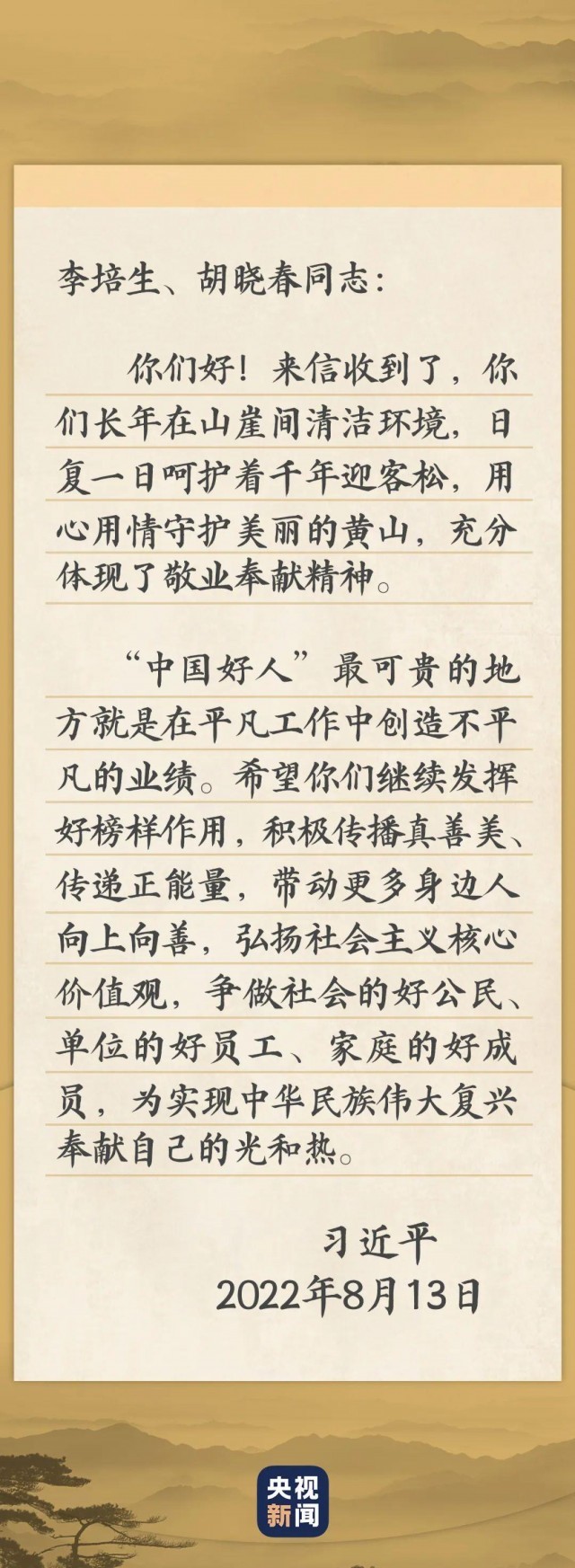 “真没有想到习近平总书记给我们回信了,这份巨大的鼓舞不仅是给我们俩,也是给黄山的,更是给所有‘中国好人’的。”接到书信的李培生和胡晓春,前行的动力十足。