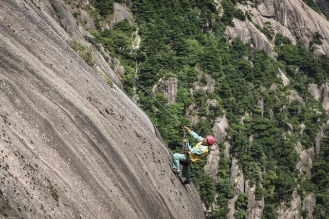 李培生是黄山景区的一名环卫放绳工。这份工作需要在悬崖峭壁上拣拾随风落向山谷的塑料袋、游客掉下的物品。