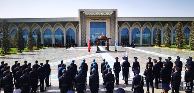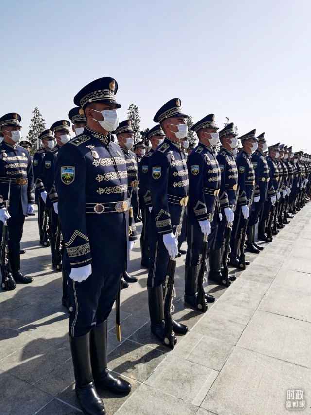 在国际会议中心的北门外广场,米尔济约耶夫总统为习主席举行了隆重的欢迎仪式。