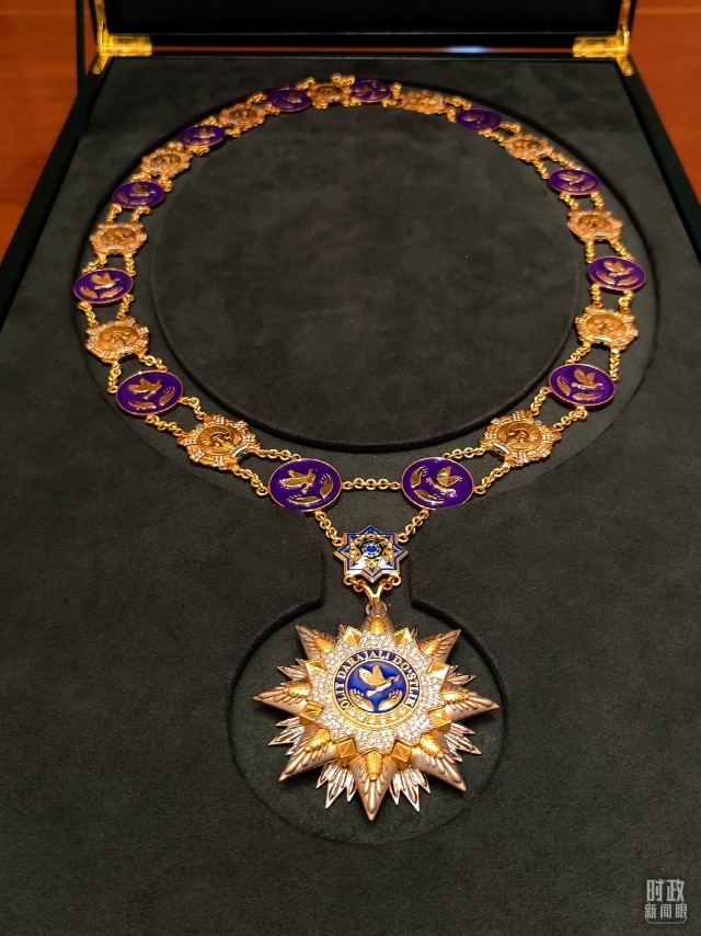 △“最高友谊”勋章章体分为4层,正中间是两只手托举和平鸽的图案,象征友谊与和平,图案外围有乌兹别克语的“最高友谊”字样。(总台央视记者薛冠南拍摄)