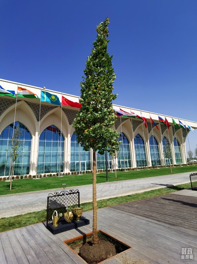 在国际会议中心北门外广场,米尔济约耶夫总统邀请习主席共同种下一棵橡树,并一起培土、浇水。
