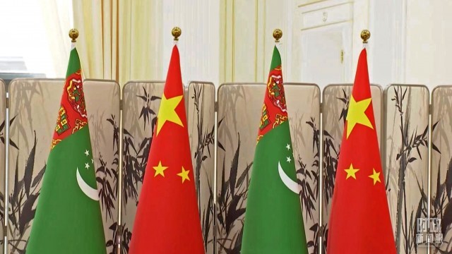 △中国、土库曼斯坦两国元首会见现场摆放的国旗。