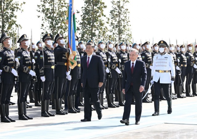 米尔济约耶夫为习近平举行隆重欢迎仪式。两国元首共同登上检阅台,军乐团奏中乌两国国歌。习近平在米尔济约耶夫陪同下检阅仪仗队。