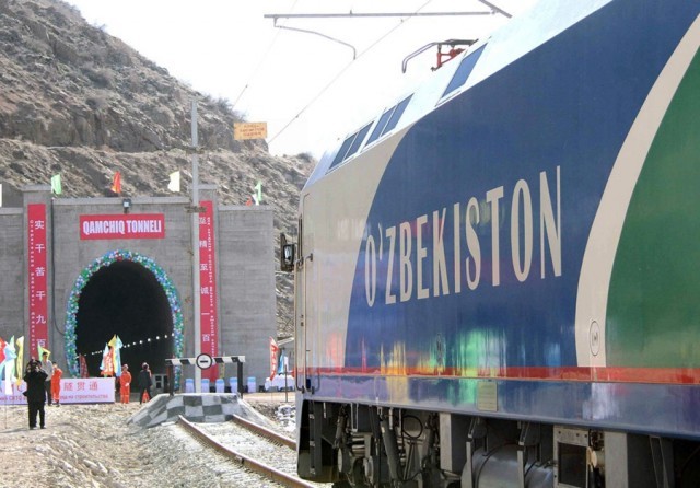 一列专列停在乌兹别克斯坦的中亚第一长隧道“安格连-帕普”铁路隧道进口(2016年2月27日摄)。这条隧道是中乌共建“一带一路”互联互通合作的示范性项目,于2016年顺利贯通。