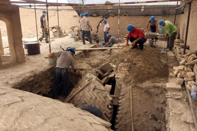 在乌兹别克斯坦希瓦古城阿米尔 图拉经学院,中乌文物修复人员在经学院东南角穹顶上方进行加固施工(2018年6月21日摄)。2021年,希瓦古城历史文化遗迹经过中乌联合修复顺利完成并移交乌方。
