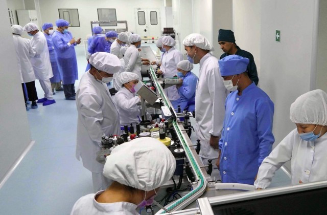 在乌兹别克斯坦制药企业祖拉贝克实验室有限公司,工作人员在由中国科学院微生物研究所和安徽智飞龙科马生物制药有限公司共同研发的新冠重组蛋白疫苗生产线上工作(2021年9月5日摄)。中国疫苗成为乌兹别克斯坦抗疫主力军并实现联合生产,抗新冠药物获批在乌兹别克斯坦临床使用,有效守护了两国人民生命安全。