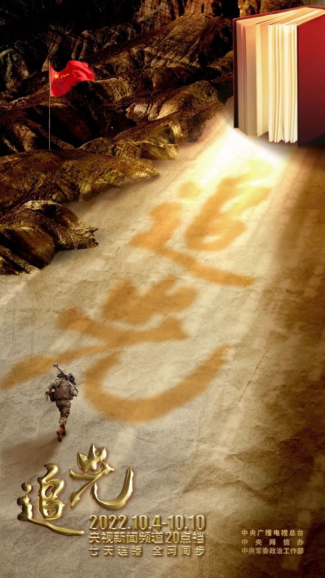经中央军委批准,由中央广播电视总台、中央网信办和中央军委政治工作部联合出品的思想解读类融媒体特别节目《追光》,10月4日起在央视新闻频道20点档首播,央视国防军事频道重播。中央主要新闻网站、重点门户网站和“学习强国”“学习强军”平台等同步推出。