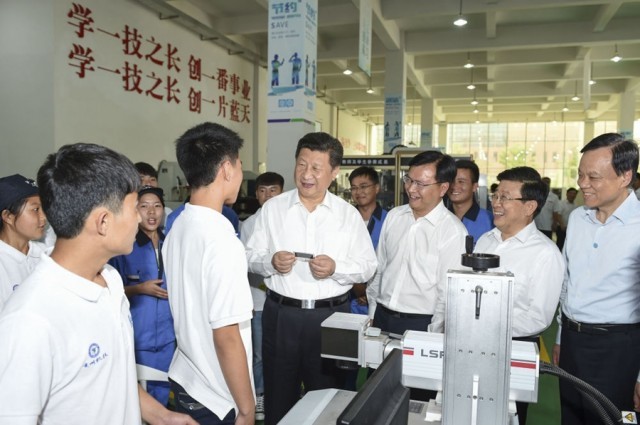 ↑2015年6月17日,习近平在贵州省机械工业学校实训基地勉励学生加强操作训练、不断取得优异成绩。