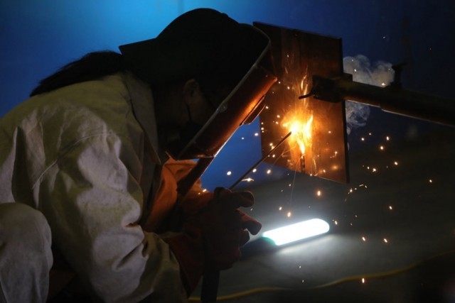 ↑2020年12月15日,一名江苏海事职业技术学院学生在辽宁沈阳参加2020“一带一路”暨金砖国家技能发展与技术创新大赛之“嘉克·通用技术杯”国际焊接大赛。