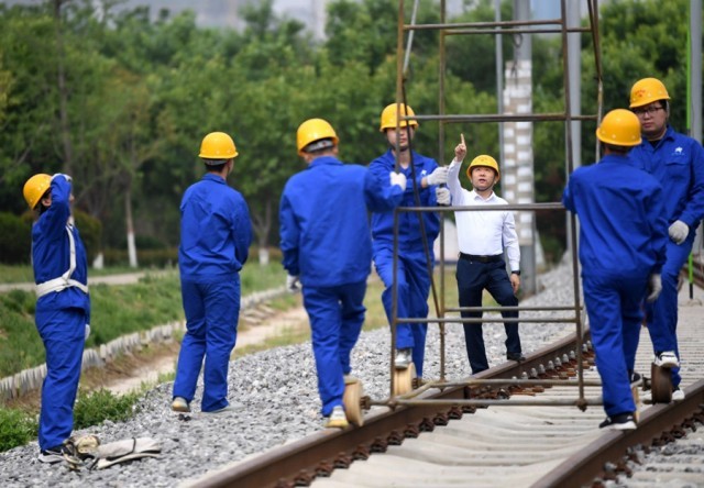 ↑2022年4月29日,在西安铁路职业技术学院,教师尚晶(右三)指导学生练习在接触网线上行走。