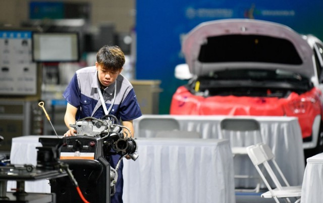 ↑2022年8月19日,在国家会展中心(天津),参加首届世界职业院校技能大赛的天津交通职业学院学生吴杰在进行发动机拆卸维护展演。