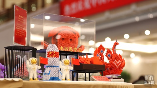 △代表团驻地一角。以6000多张废弃纸张为材料,制作成红船摆件、书签等,表达对党的真挚祝福。(总台央视记者魏帮军拍摄)