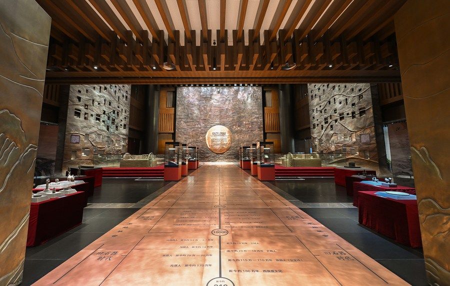 习近平走进院内的中国考古博物馆,先后参观文明起源和宅兹中国专题展,了解新石器时代和夏商周时期重大考古发现,并不时询问相关研究工作进展。