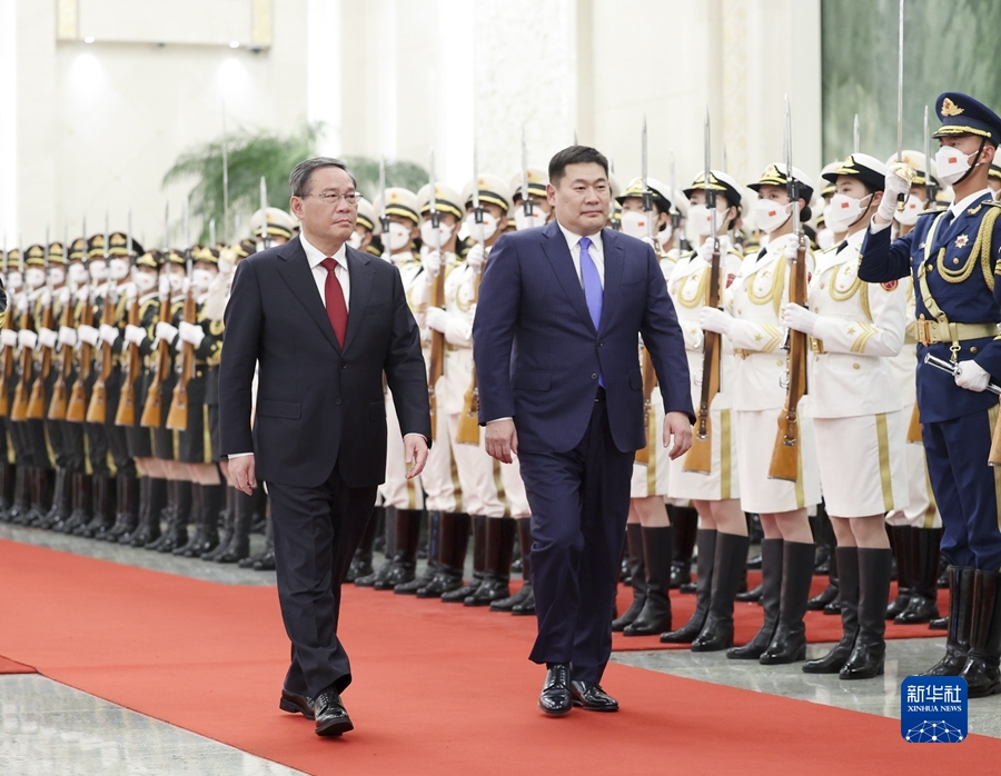 会谈前,李强在人民大会堂北大厅为奥云额尔登举行欢迎仪式。