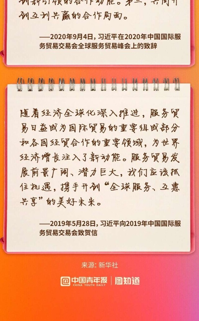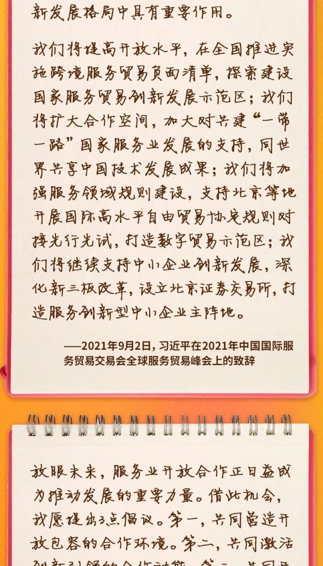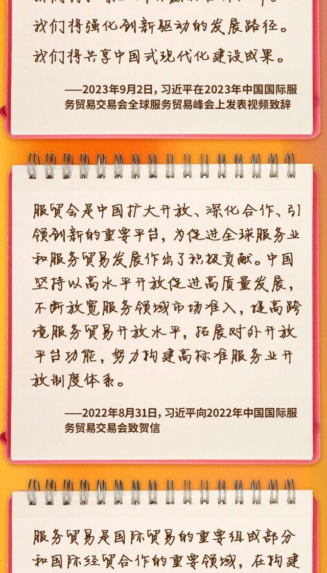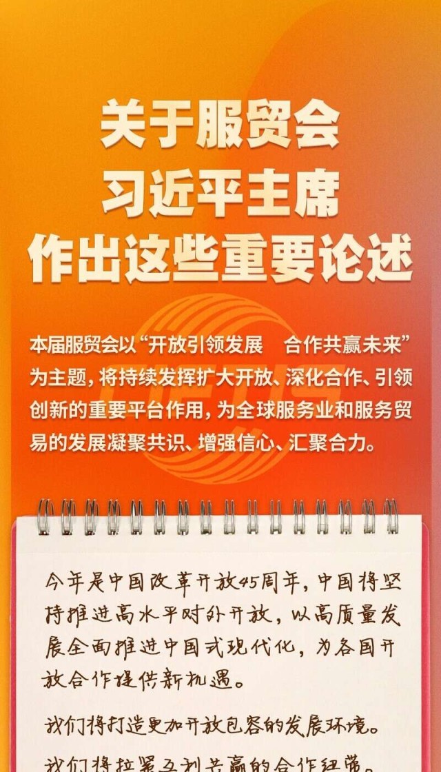 2023年中国国际服务贸易交易会今天开幕。服贸会是中国扩大开放、深化合作、引领创新的重要平台,为促进全球服务业和服务贸易发展作出了积极贡献。近年来,习近平主席多次在服贸会上作出重要论述,一起来学习。