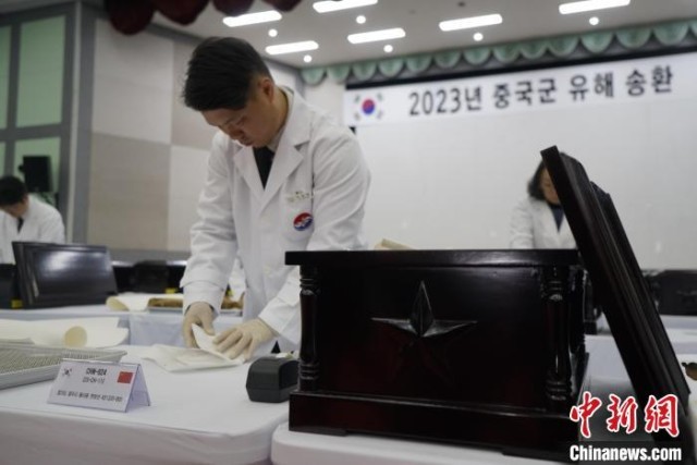当地时间11月22日上午,第十批在韩中国人民志愿军烈士遗骸装殓仪式在韩国举行。图为韩方工作人员对志愿军烈士遗骸进行装殓。中新社记者 刘旭 摄