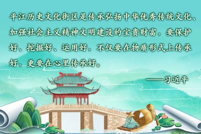 2023年7月6日上午,习近平总书记来到位于苏州古城东北隅的平江历史文化街区考察调研。他说:“住在这里很有福气,古色古香,到处都是古迹、到处都是名胜、到处都是文化。‘百步之内,必有芳草’,这句话可以用在这里。”