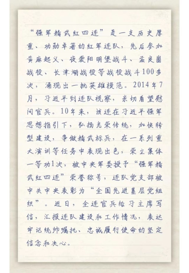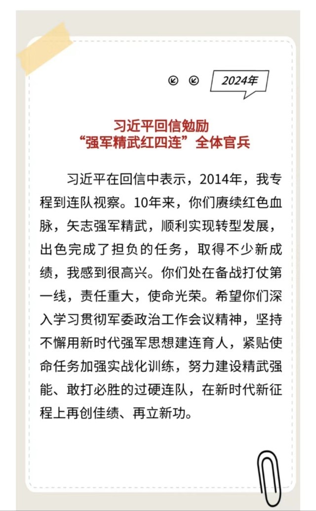 习主席给“强军精武红四连”全体官兵回信