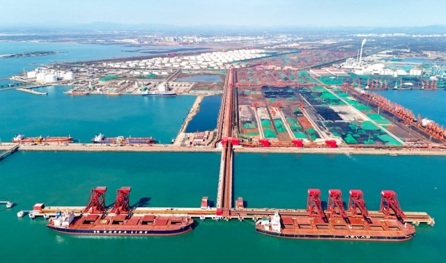在山东青岛拍摄的山东港口青岛港第二座40万吨矿石码头(2025年10月27日摄,无人机照片)。新华社发(张进刚 摄)