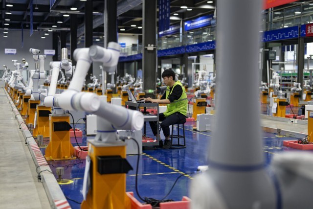 工作人员在山东省日照市经济技术开发区越疆机器人日照生产基地对机械臂产品进行测试(2025年5月24日摄)。新华社记者 张笑宇 摄