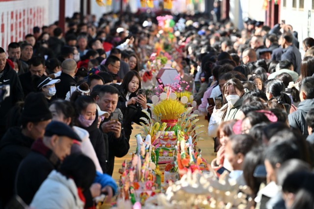 人们在山西省吕梁市岚县岚城镇欣赏面塑作品(2025年3月18日摄)。新华社记者 詹彦 摄