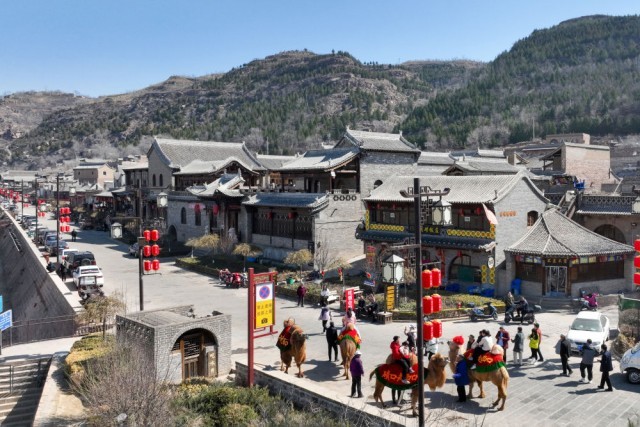 游客在山西省吕梁市临县碛口古镇骑骆驼(2025年3月19日摄,无人机照片)。新华社记者 詹彦 摄