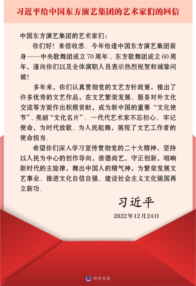 2022年,习近平总书记给中国东方演艺集团的艺术家们回信,勉励他们为建设社会主义文化强国再立新功。