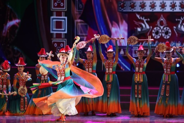 2026年1月7日,甘肃省张掖市裕固美舞蹈团的演员在甘肃省群众文艺展演展播活动首场演出中表演民族舞蹈。