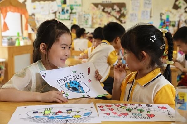 2025年6月5日,在浙江省湖州市德清县乾元镇的县中心幼儿园,小朋友交流她创作的爱眼日绘画作品。视觉中国供图