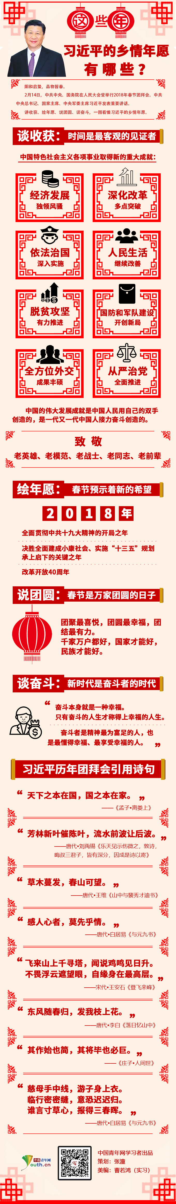 中国青年网北京2月16日电 (记者 张潼 实习记者 曹若鸿) 阳和启蛰,品物皆春。2月14日,中共中央、国务院在人民大会堂举行2018年春节团拜会。中共中央总书记、国家主席、中央军委主席习近平发表重要讲话。讲收获、绘年愿、说团圆、谈奋斗,一图看懂习近平的乡情年愿!