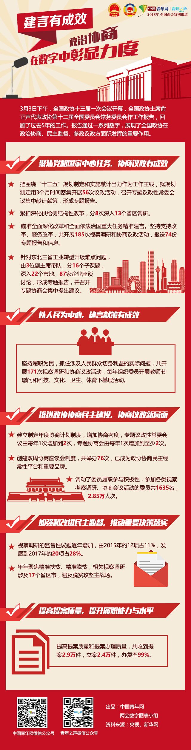 中国青年网北京3月3日电 3月3日下午,全国政协十三届一次会议开幕,全国政协主席俞正声代表政协第十二届全国委员会常务委员会作工作报告,回顾了过去5年的工作。报告通过一系列数字,展现了全国政协在政治协商、民主监督、参政议政方面所发挥的重要作用。