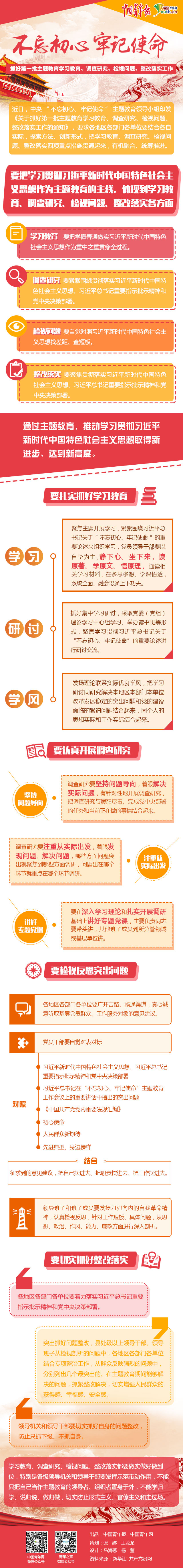 中国青年网北京6月25日电 近日,中央“不忘初心、牢记使命”主题教育领导小组印发《关于抓好第一批主题教育学习教育、调查研究、检视问题、整改落实工作的通知》,要求各地区各部门各单位要结合各自实际,探索方法、创新形式,把学习教育、调查研究、检视问题、整改落实四项重点措施贯通起来,有机融合、统筹推进。