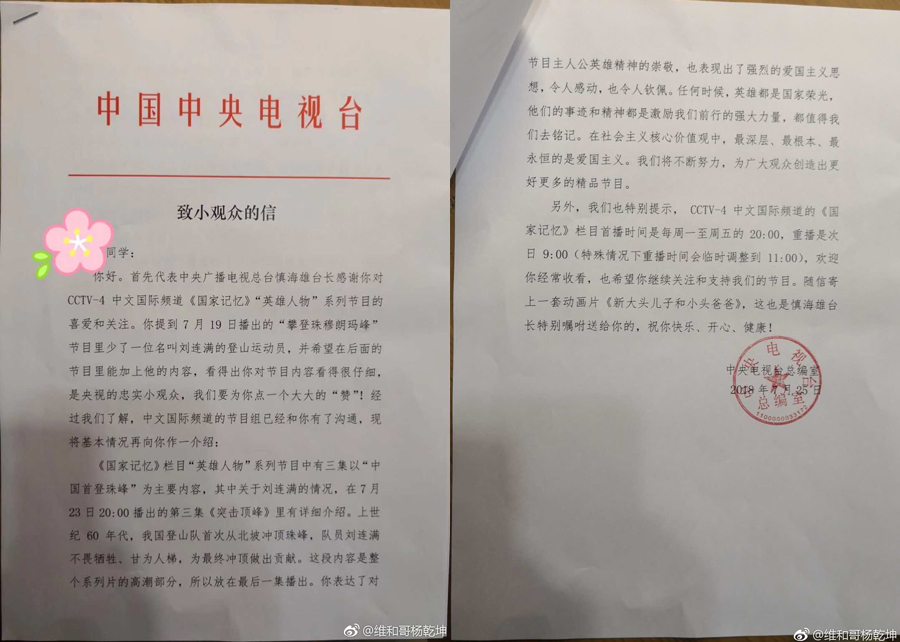 中央电视台总编室给妞妞小朋友的回信。