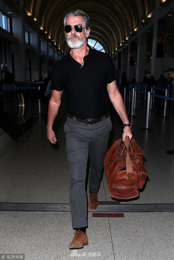 新浪娱乐讯 当地时间2018年1月17日,美国洛杉矶,“前任007”皮尔斯·布鲁斯南现身机场。布鲁斯南年过花甲型男范依旧,打扮精致考究,胡子白花花,依然魅力不减。