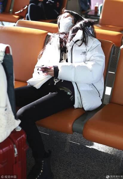 2018年2月4日,张碧晨身着白色羽绒服素颜现身北京机场,口罩遮面略显疲惫,毫无偶像包袱,直接瘫坐在候机椅子上。