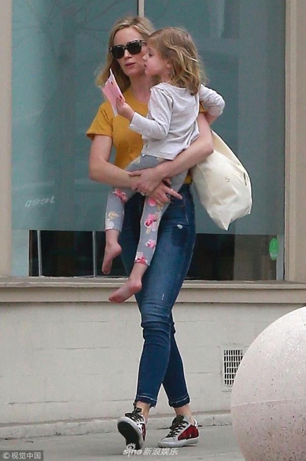 组图:艾米莉·布朗特墨镜遮面辣妈范十足 抱光脚丫女儿走路带风
