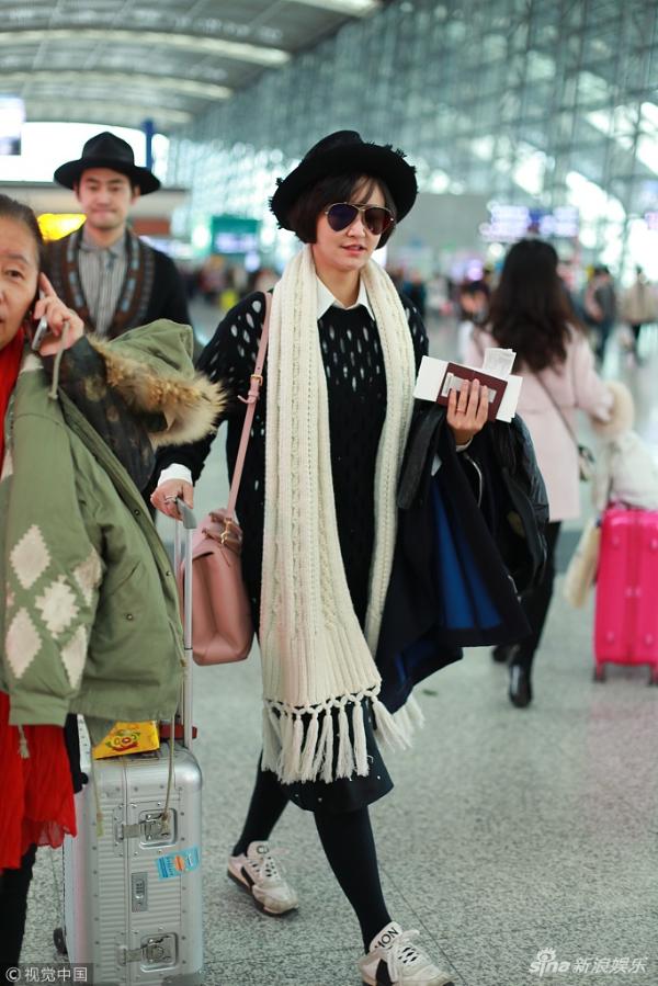 新浪娱乐讯 2月18日,成都,袁弘、张歆艺夫妇戴“情侣帽”恩爱现身机场,二人各推小行李匆匆赶路。(视觉中国/图)