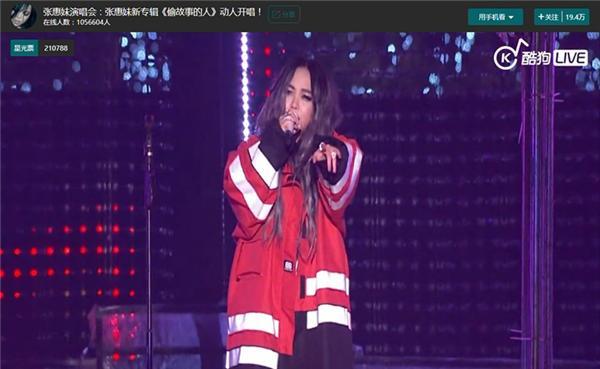 2月4日晚张惠妹在台北举办新专辑《偷故事的人》演唱会,贴心的阿妹为了让粉丝可以无压力享受演出,先是线上抽奖幸运粉丝包机酒门票,又是现场留票防止黄牛,却万万没有办法阻止演出当天下雨,而本次演出又是户外场地,但穿着雨衣的热情民众站满了场地和线上围观直播的网友,让这场寒流中进行的演唱会显得温情十足。酷狗直播也对本次演唱会进行了直播,最高峰有105万粉丝在线上欣赏张惠妹的演出,不难感受出她的亚洲天后地位。