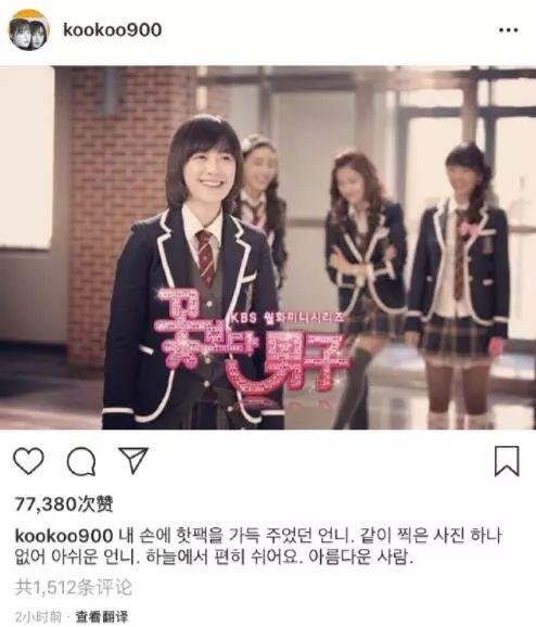 韩国女星具惠善3月17日在社交网站上晒出一张《花样男子》的剧照,并配文:“塞暖宝宝在我手里的姐姐,遗憾一张合照都没有,在天上好好休息吧。”