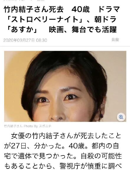 据媒体最新消息,日本女演员竹内结子去世,享年四十岁。警方在其位于东京都内的家中发现了尸体。由于有自杀的可能性,警视厅正在慎重调查。