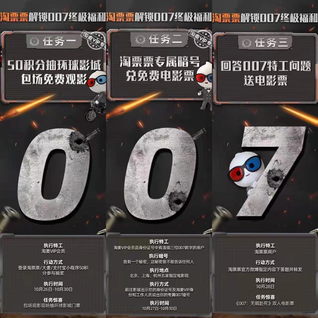 首先,淘麦VIP可以用50积分报名参加《007:无暇赴死》的会员专场,在环球城市大道电影院VIP厅观看影片首映,并且还能在映后抽奖获得环球影城乐园门票+惊喜福利;其次,北京、上海、杭州的淘麦VIP会员,如果身份证中带有“007”的数字,即可去指定影院领取007电影的免费票;此外,用户还能够在线上参与趣味知识问答,赢取007相关奖品。