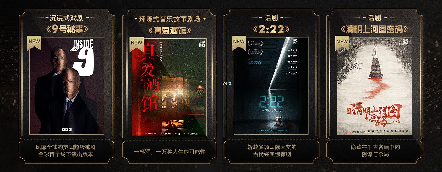 近日,大麦旗下戏剧厂牌“当然有戏”发布了2023年度片单,其中首度官宣的四部新创剧目引发了行业的广泛关注与讨论:《9号秘事》、《2:22》、《清明上河图密码》、《真爱酒馆》,这四部源于知名英剧、西区爆款、畅销图书、真实故事四个维度推出的四部风格各异的作品,也宣示着当然有戏厂牌广泛获取内容、持续加码优质内容建设的决心。加上此前已演出的《皮囊》、《弗兰肯斯坦》、《道林格雷的画像》等多部广受好评的经典佳作,可以预见的是,未来当然有戏将持续为剧场观众带来更多优质的戏剧内容和现场体验。