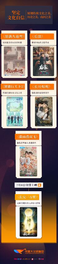 为进一步弘扬传统文化,展示东方美学,呈现中国人代代相传的乐观向上、自信开放的人文精神,阿里影业还参与出品了刻画大唐诗人群像的动画巨制《长安三万里》,该片将于7月8日在全国上映。此外,优酷也将深耕重大主题,积极发力“英雄赞歌”系列,陆续推出多部彰显民族力量的作品。如以抗美援朝为背景的革命题材剧《上甘岭》《侦察英雄》;还原舰载机机群成功试飞的军旅剧《海天雄鹰》;以及纪念援外医疗60周年的现实题材剧《欢迎来到麦乐村》等。