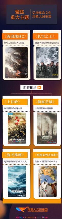阿里大文娱集团是阿里巴巴旗下六大业务集团之一,以优酷、阿里影业、大麦为三大核心引擎,覆盖在线视频、电影以及戏剧、音乐演出等文化娱乐领域。近年来,阿里大文娱坚持以人民为中心的创作导向,先后参与推出了“我和我的”系列影片、《长津湖》系列影片、《流浪地球》系列影片、《红海行动》《烈火英雄》《中国机长》等多部新主流大片,以及《觉醒年代》《功勋》《幸福到万家》《血战松毛岭》等多部主旋律剧集。
