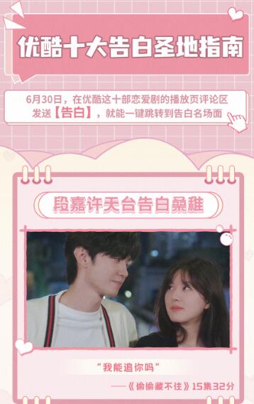 近日,随着正在优酷热播的《偷偷藏不住》迎来高甜名场面,弹幕区变成了众多观众的“暗恋树洞”,一夜间10万条告白弹幕在男主告白的剧情下刷屏。今天,优酷发布“十大告白圣地指南”,《冰糖炖雪梨》、《点燃我温暖你》等10部宠爱剧场剧集上线“一键跳转”功能,在播放页评论区发送关键词“告白”,就能跳转到告白名场面。