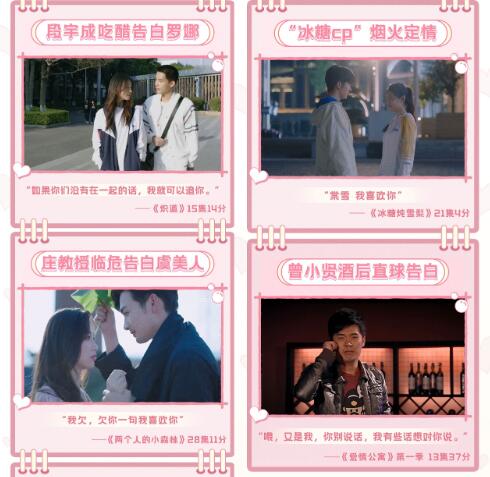 据了解,在“优酷十大告白圣地指南”中,最早的“景点”是2009年上线的《爱情公寓》第一季,最新的“景点”则是正在热播的《偷偷藏不住》,《冰糖炖雪梨》、《炽道》、《两个人的小森林》等同类型剧集也在这份指南里。其中《偷偷藏不住》段嘉许天台告白桑稚、《点燃我,温暖你》朱韵勇敢追爱、《冰糖炖雪梨》黎语冰棠雪烟火下定情……都是剧迷心中印象深刻的告白名场面,弹幕里也沉淀了网友留下的大量告白与祝福。