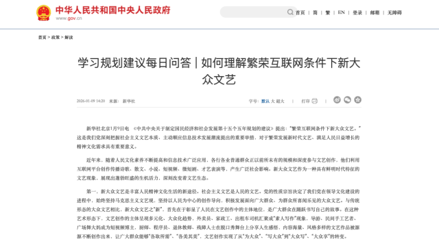 (《如何理解繁荣互联网条件下新大众文艺》,中国政府网)